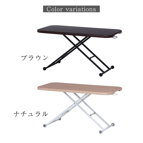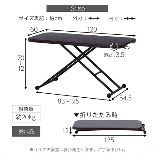 ■商品仕様(材質) ■材質 天板:プリント紙化粧繊維板(ポリウレタン樹脂塗装) 脚:スチール(エポキシ樹脂塗装) ■耐荷重:約20kg ■カラー:ブラウン、ナチュラル ■個口数:1 ■商品サイズ(単位:約mm) ■商品外寸:幅1200×奥行600×高さ120〜700 ■商品重量:約16.7kg ■梱包サイズ:幅1330×奥行660×高さ140 ■梱包重量:約19.2kg ※サイズの誤差は多少発生します。