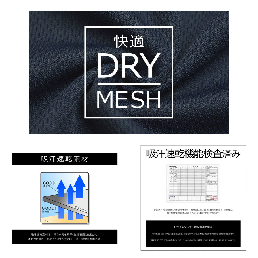 吸水性、伸縮性、通気性などアクティビティに必要な機能を備えた ドライメッシュ素材を使用しております。